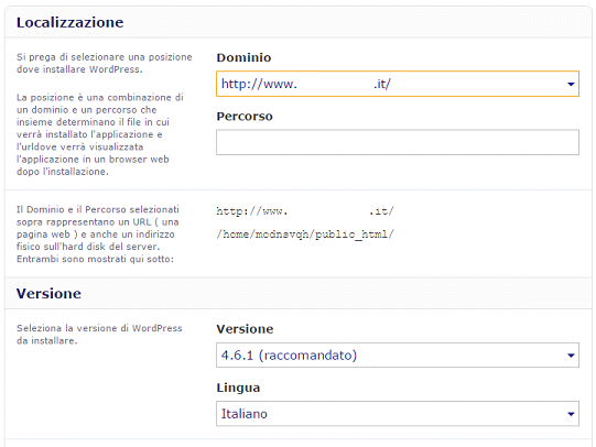 - “Percorso” indicherai all’applicativo la cartella dove installare WordPress, questo campo deve essere lasciato vuoto affinché l’installazione avvenga automaticamente all’interno della cartella di default public_html, il sito sarà così raggiungibile da link diretto senza sottocartelle o sottodomini.